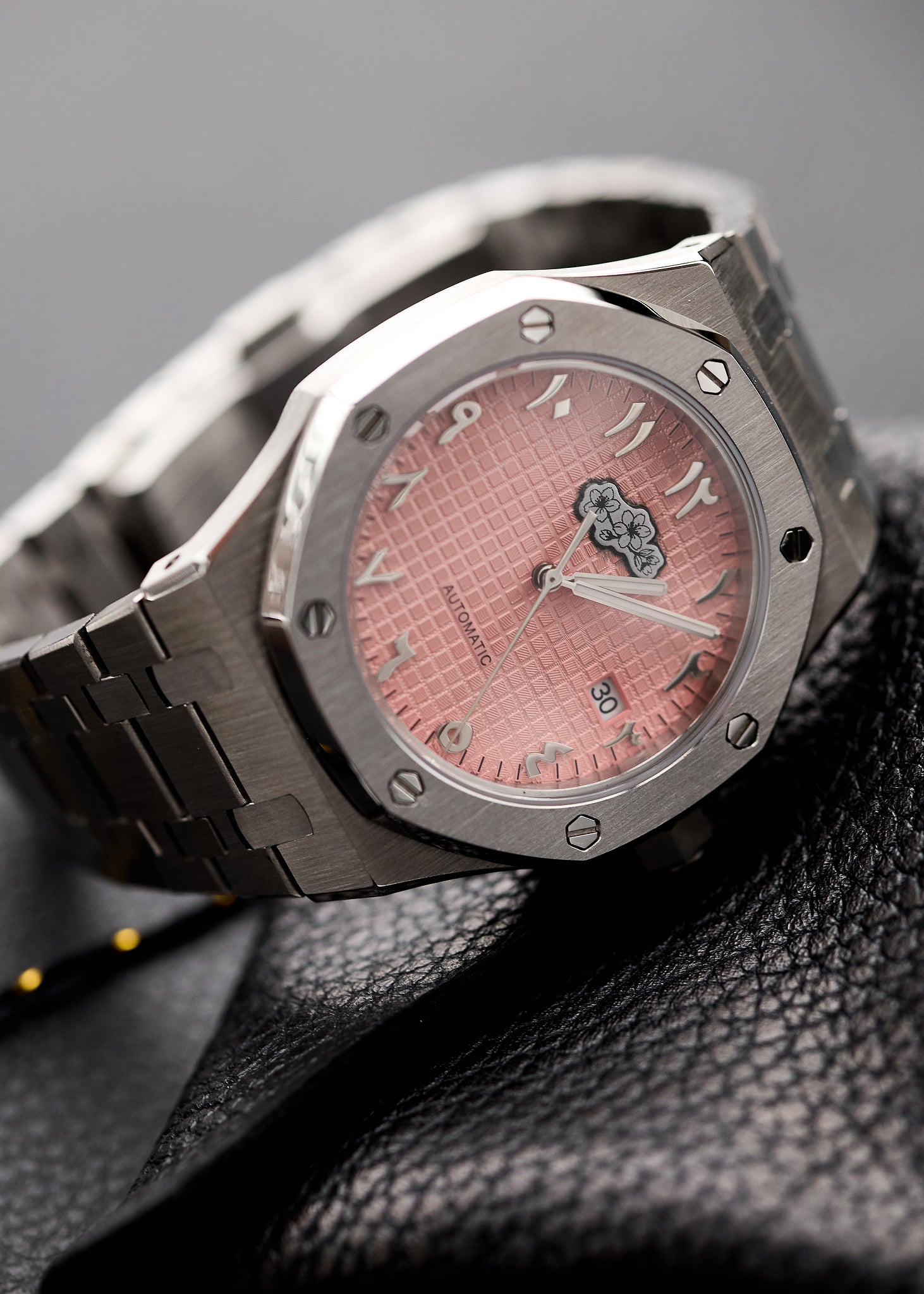 The dial, finished in a soft sakura-pink hue, features a fine geometric square texture that plays beautifully with light, giving it depth and a delicate shimmer. The Arabic numerals, polished and applied in a flowing style, enhance the watch’s graceful aesthetic while maintaining legibility.