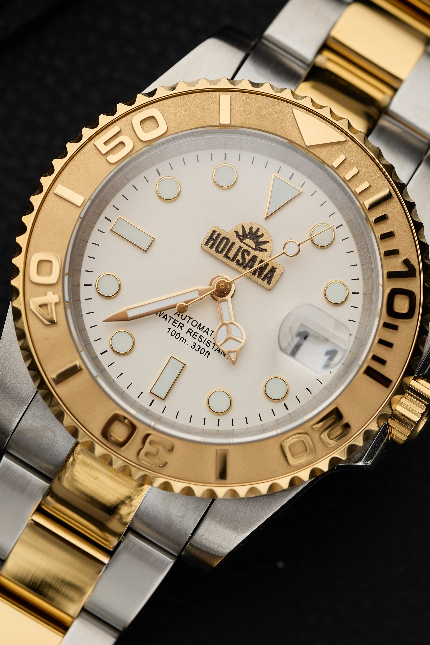 The watch features a crisp white dial that contrasts beautifully with the polished gold indices and hands, achieving an elegant yet confident aesthetic. At its heart lies the custom “Holisana” logo, a brass emblem engraved and hand-filled with wax, complemented by a rising-sun motif that symbolizes optimism and vitality — a perfect reflection of its owner’s spirit.