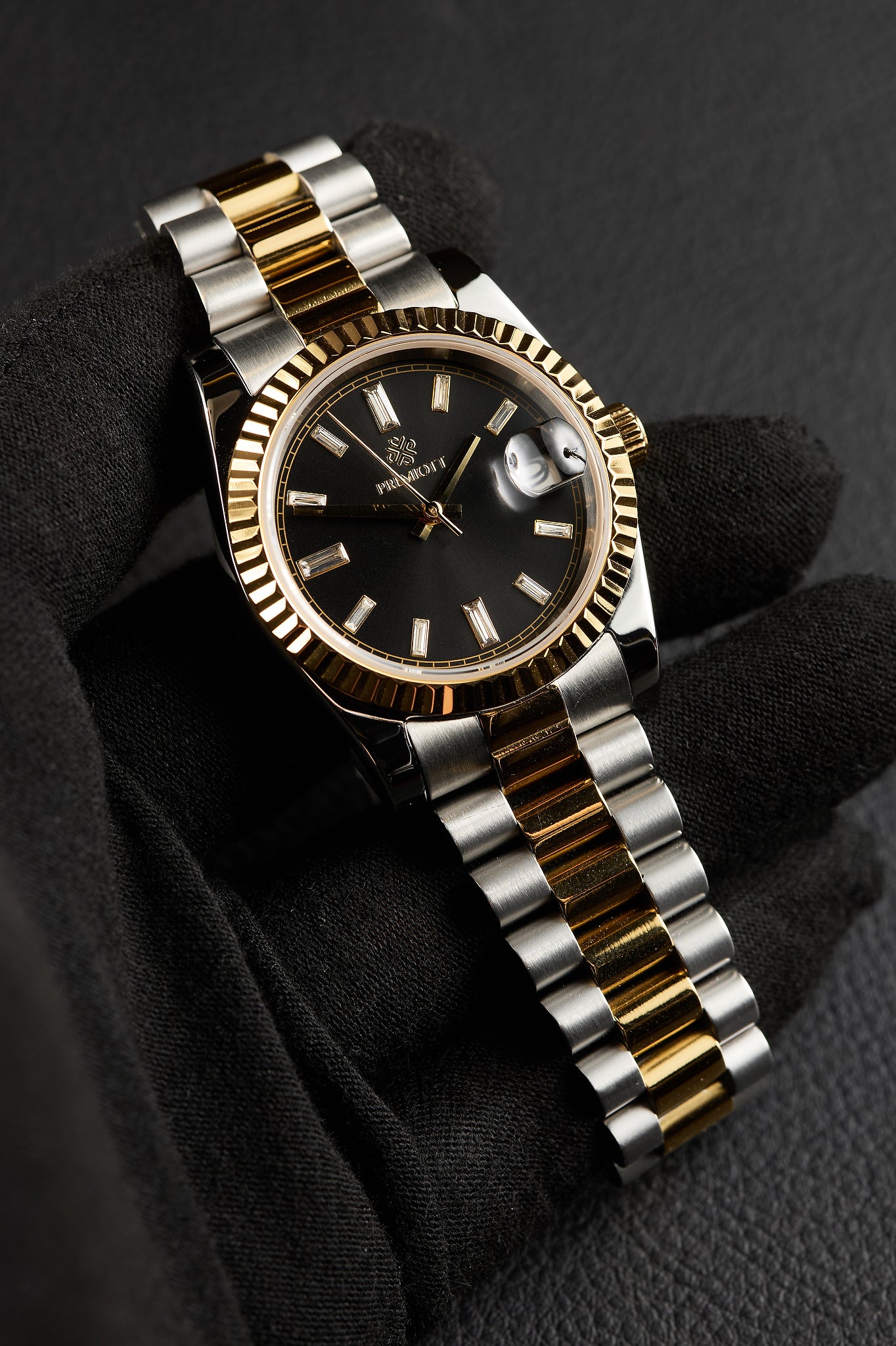 Introducing the "Lady Just", a beautifully crafted homage to the classic Rolex® DateJust®. This versatile timepiece combines traditional elegance with contemporary features, making it an excellent choice for those who value both style and functionality.